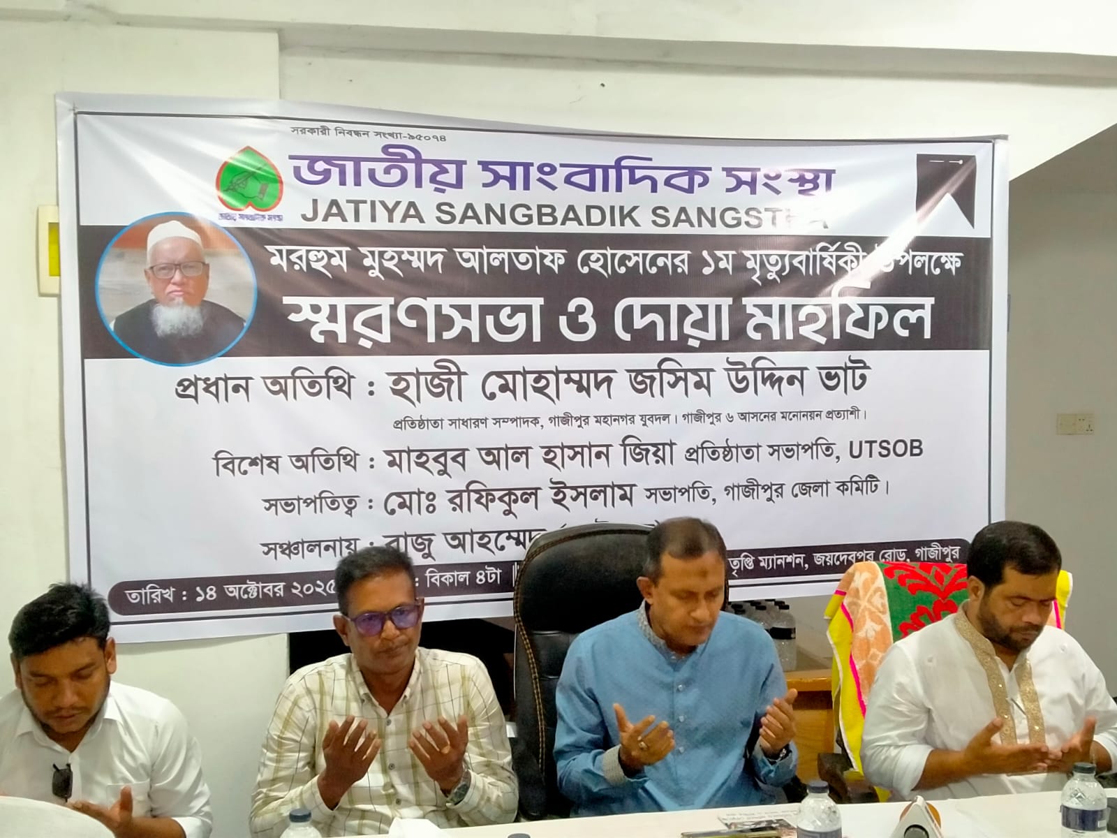 প্রথম মৃত্যুবার্ষিকী উপলক্ষে জাতীয় সাংবাদিক সংস্থা গাজীপুর জেলা কমিটির উদ্যোগে মরহুম সাংবাদিক মুহাম্মদ আলতাফ হোসেনের কর্মময় জীবনের স্মৃতিচারণ ও দোয়া মাহফিল অনুষ্ঠিত হয়।
